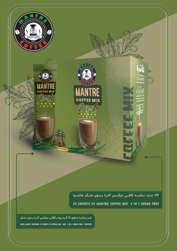 ترکیبی از پودرقهوه و پودر شیر ( بدون شکر و رژیمی ) : هر ساشه حاوی ۱۲ گرم پودر کافی میکس ۲ در ۱ بدون شکر